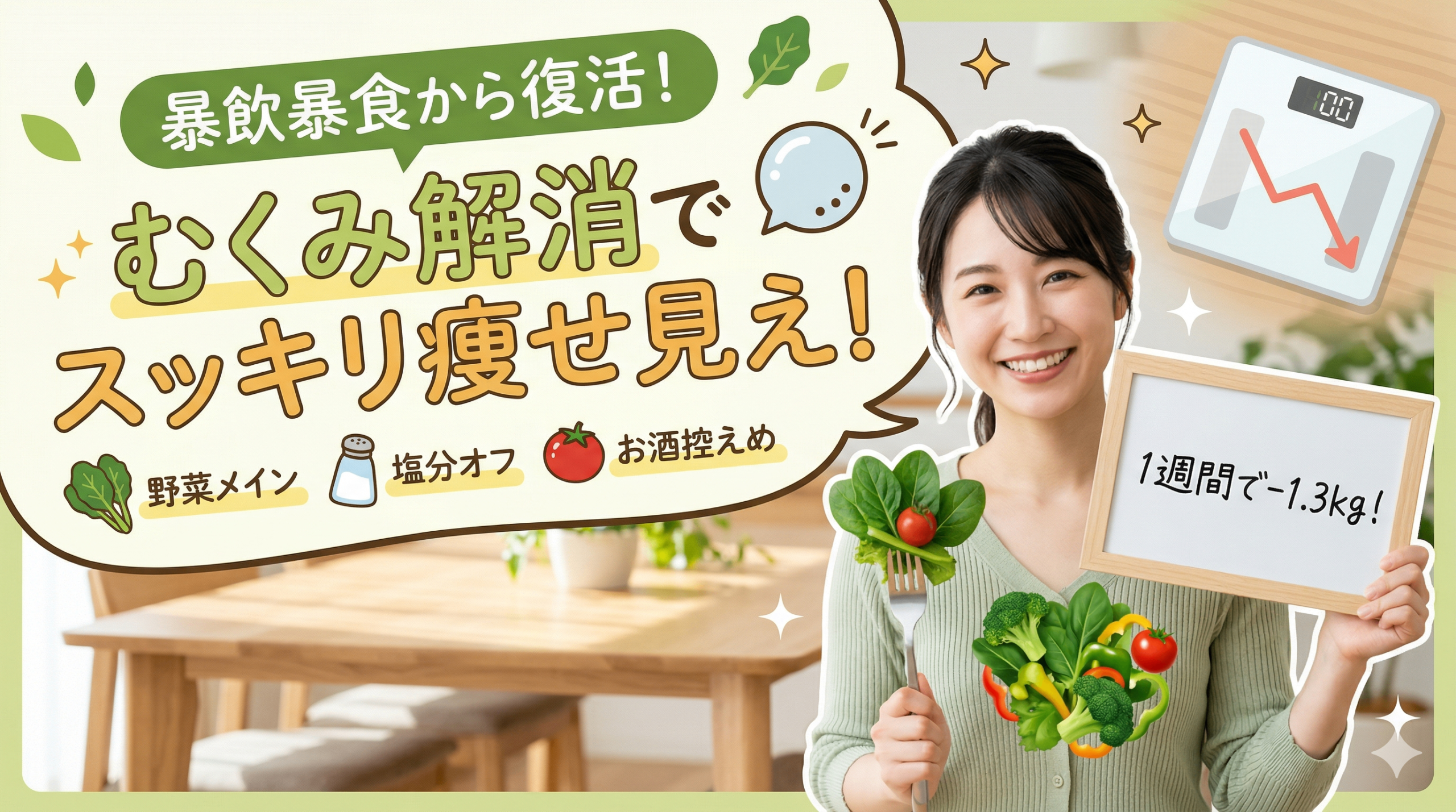 むくみは「余分な水分と塩分が体に溜まっている状態」。野菜に含まれるカリウムが塩分の排出を助けてくれる。だから野菜中心の食事はむくみ解消に直結する。